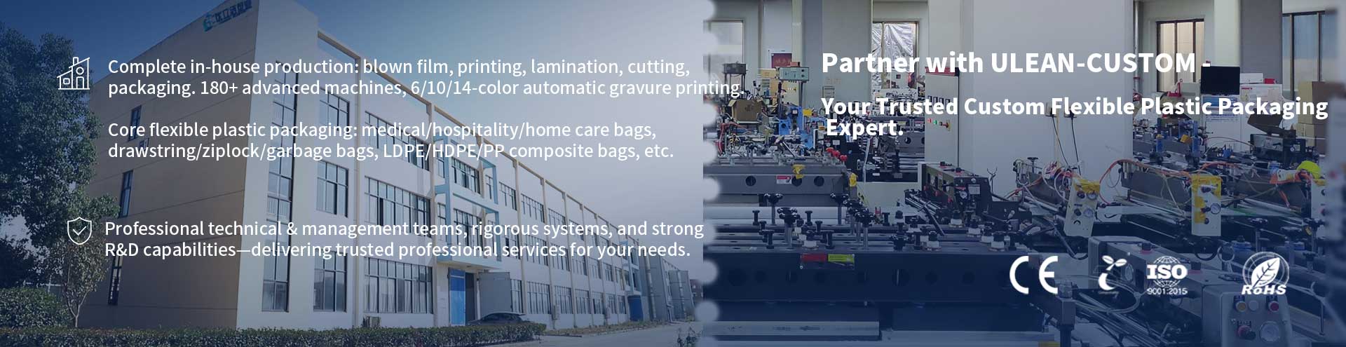 Founded in 2004, ULEAN-CUSTOM is a trusted plastic packaging specialist based in Tongcheng, Anhui—"Central China Soft Packaging Base"—with convenient access to highways, railways, airports, and ports for global logistics.